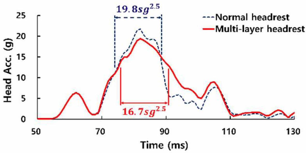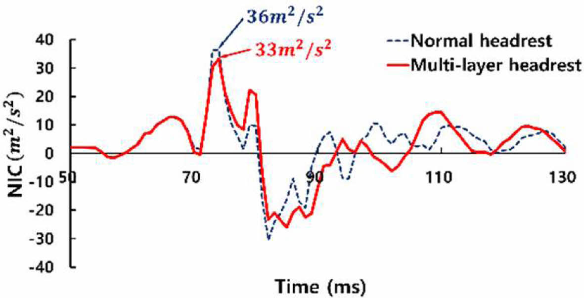 Validation model에서의 일반headrest와 multi-layer headrest간의 전체 해석 비교 결과 두 headrest 모두 57 ms에서 첫 접촉이 발생하게 되며 일반headrest의 접촉종료시점은 124 ms이고 multi-layer headrest는 120 ms로 나타났다. HIC는 식 (1)을 통해 전체 두부 가속도에서 15 ms 동안 두부에 가해진 가속도를 대입하여 계산한 결과 중 최대값을 나타내며 일반 headrest의 경우 74~89 ms에서 최대 19.8 sg2.5로 도출되었고 multi-layer headrest는 76~91 ms에서 최대 16.7 sg2.5로 Fig. 12와 같다. 두 headrest의 HIC 최대값을 비교해보면 일반headrest대비 multi-layer headrest가 두부 감속에 효과적인 것을 알 수 있다. NIC의 경우 식 (2)를 통해 계산되었으며 일반 headrest의 최대 NIC는 74 ms에서 36 m2/s2로 나타났고 multi-layer headrest의 최대 NIC는 74 ms에서 33 m2/s2로 Fig. 13과 같다. 이는 흉추골과 두부의 상대가속도와 상대속도를 통해 계산되는 NIC의 특성상 multi-layer headrest의 압축특성으로 인해 머리가 뒤로 젖혀질 때 충분한 감속이 이루어져 일반headrest대비 NIC 값이 낮게 나온 것으로 판단되어진다.
