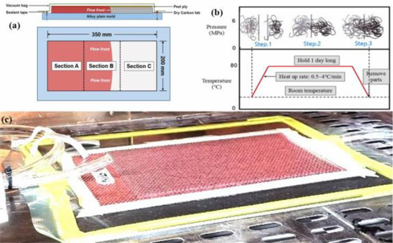 Fig. 1 a) Flow section of VaRTM, b) curing cycle of VaRTM, and c) experimental representation composites processing |