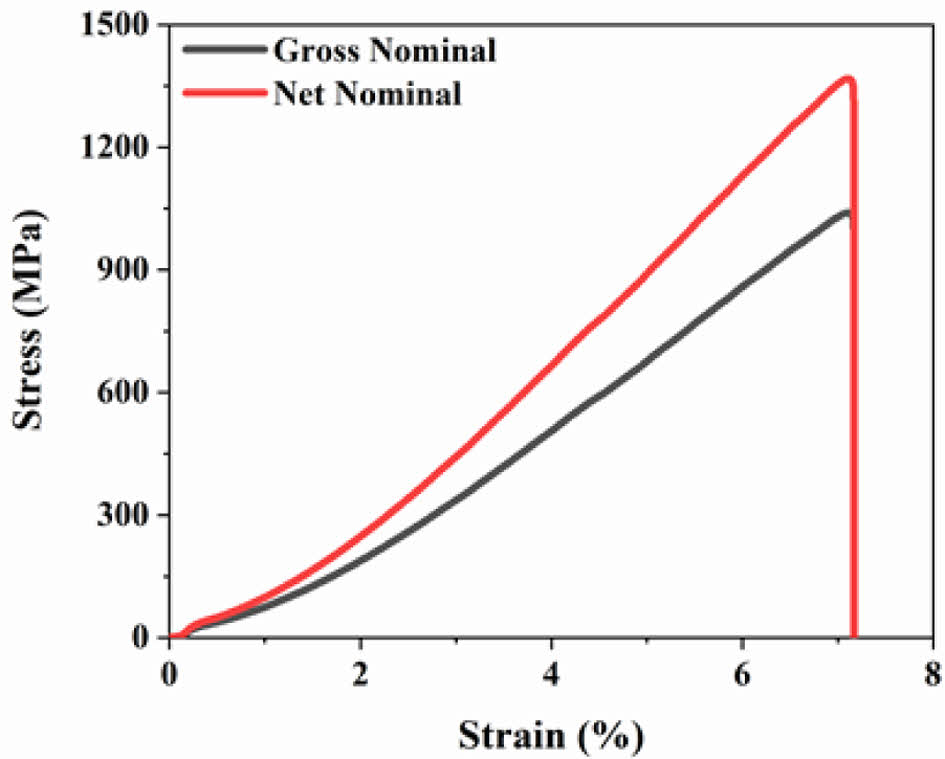 Fig. 2 Gross nominal and net nominal stress-strain curves CF/ epoxy composites |