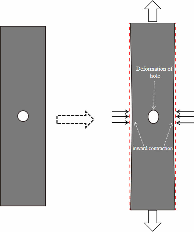 The open hole strength data may be useful for both materials selection and for estimation of structural reliability. To elucidate the effect of stress concentration on the tensile strength of composites with open circular holes were tested with tension. The typical gross nominal and net nominal stress-strain curves of composites are shown in Fig. 2. The gross nominal stress-strain curves of the open hole specimens followed the curve path of the net nominal stress-strain curves up to certain strain values after that started to divert. This may be because of increasing hole size (as shown in the Fig. 4a), caused to get the higher net nominal modulus and strength (1376 MPa) than that of the gross nominal (strength = 1041 MPa). The phenomenon of stiffening arises as a consequence of the reduced cross-sectional area in specimens containing open holes. Under loading conditions, the presence of these holes induces lateral deformation in the two ligaments. In such instances, the inward contraction acts as a restraining load against longitudinal deformation as shown in the Fig. 3. As a result, the affected region surrounding the hole exhibits a diminished magnitude of longitudinal deformation. This stiffening phenomenon has been observed by previous researchers [7,9,17,18]. Their studies have revealed that varying the size of the hole prior to final failure leads to an increased modulus and strength (specifically, the net nominal modulus and strength) compared to the gross nominal modulus and strength. The failure in the open hole specimens started from hole edge perpendicular to application of the load (as it marked in the specimens Fig. 4a). It results in the splitting failure of the matrix initiated at the hole edge and hole grew in size with increasing load up to the final fracture of the fiber (as shown in the Fig. 4b) and specimens.