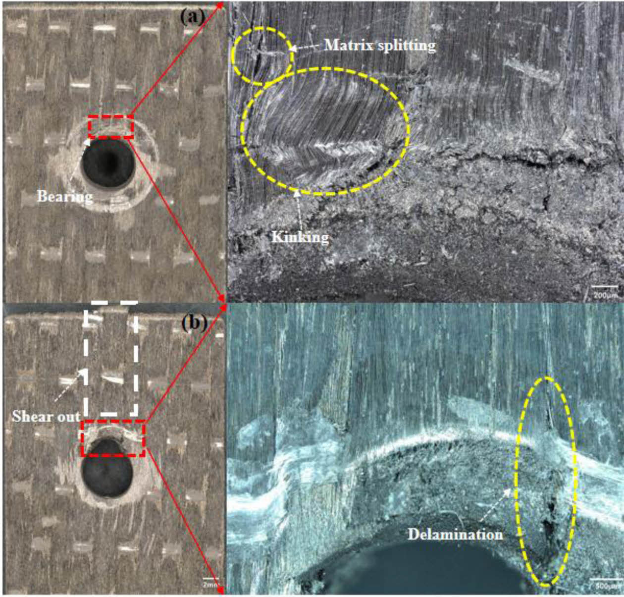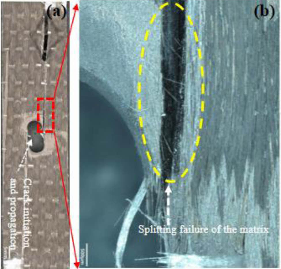 Fig. 4 Optical images showing the final failure of CF/epoxy composites a) full Open-hole tensile (OHT) specimens, b) hole edge area |