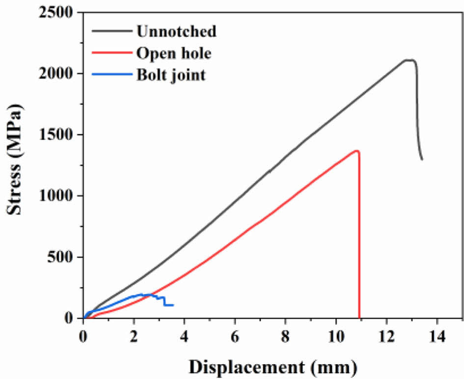 Fig. 5 Representing typical stress-displacement responses for open hole and bolt joint CF/epoxy |