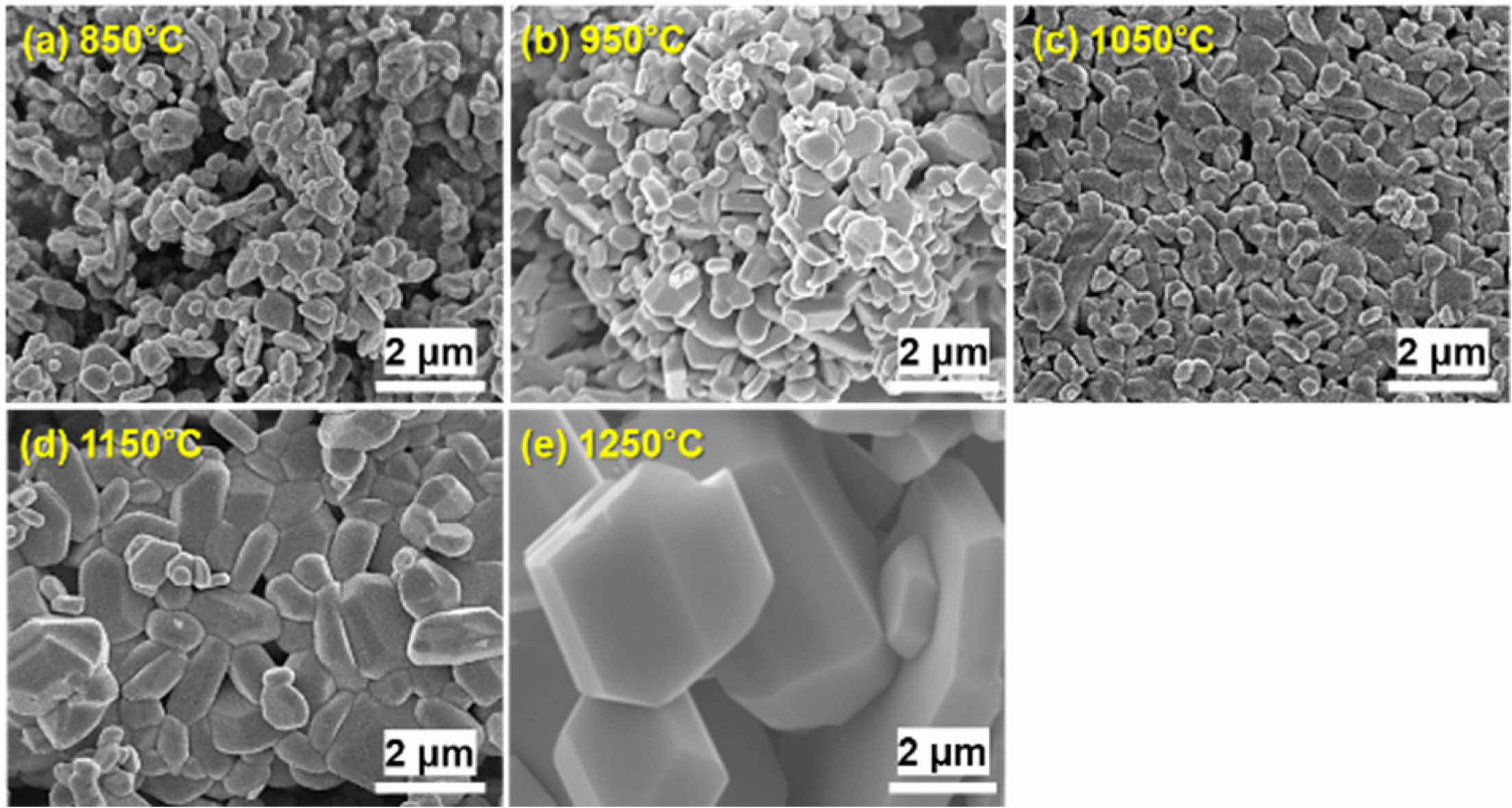 Fig. 1은 Sol-gel법으로 합성된 M형 페라이트의 하소 온도에 따른 입자의 SEM 이미지이다. Sol-gel 반응으로 건조된 gel을 40 wt%의 NaCl과 함께 하소(calcination)하였으며 이때 하소 온도는 NaCl의 용융점인 801°C보다 높은 850°C부터 진행하여 NaCl의 용융에 따른 액상반응을 유도하였다. Fig. 1에서 보이는 바와 같이, 모든 하소 온도 조건에서 육각형의 판상 입자가 형성된 것을 확인할 수 있으며 하소 온도가 증가할수록 합성된 입자의 크기가 증가하여 1250°C의 하소 온도에서는 수 μm급으로 성장하였다. 일반적인 sol-gel 법으로 합성된 입자의 경우 수 μm 이상의 크기를 가지는 입자의 형성이 어렵지만 본 연구에서는 NaCl을 용융염으로 첨가한 결과 상대적으로 큰 크기의 입자가 형성되었다. 이는 높은 하소온도로 인해 용융염 내에서의 물질 확산이 용이해짐에 따라 입자의 성장이 촉진되어 나타난 결과이다.