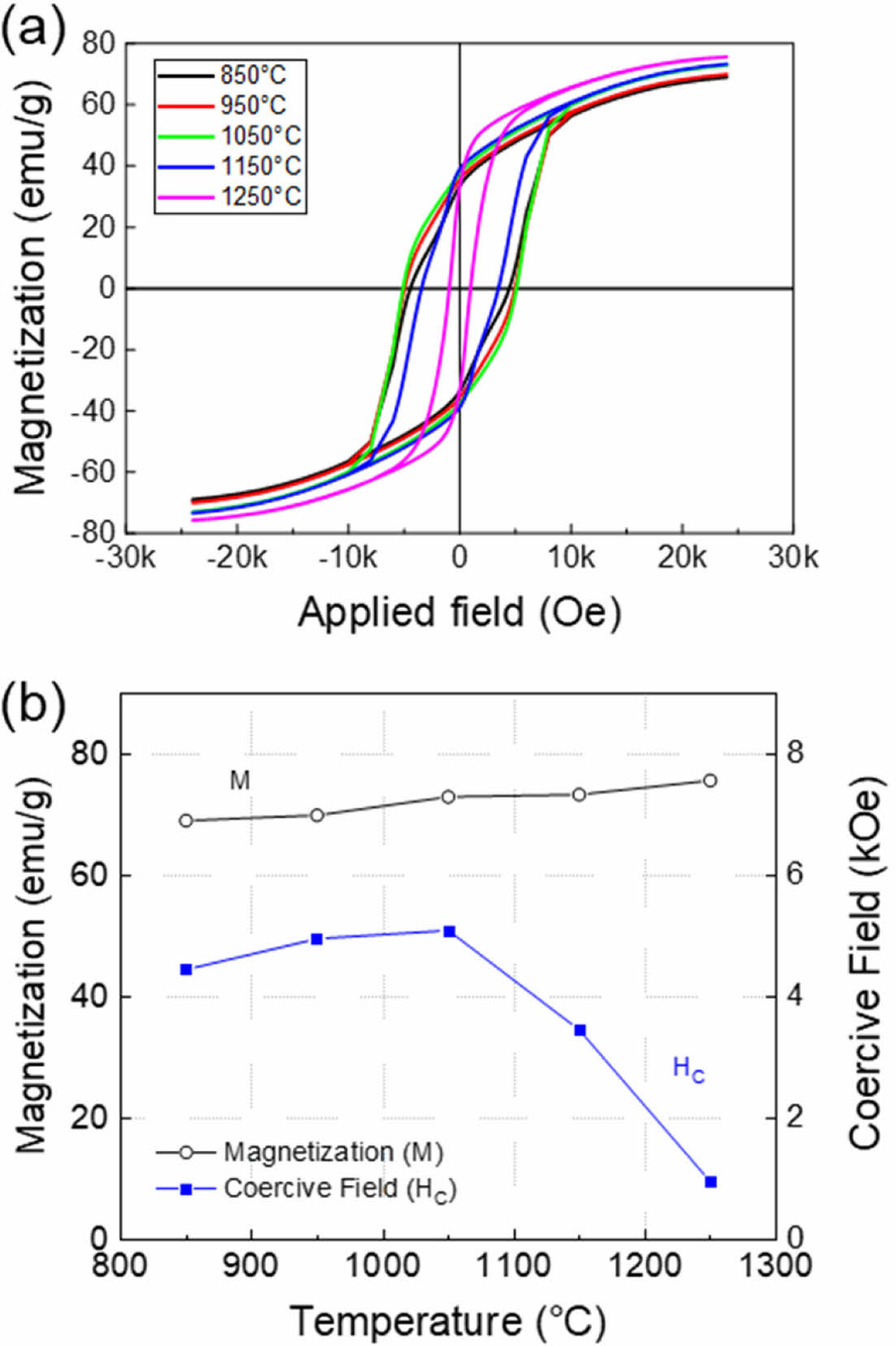 제조된 M형 페라이트의 하소 온도에 따른 자기적 특성을 분석하기 위해 자기이력곡선을 VSM을 통해 측정하였으며 이를 통해 얻어진 자화값 및 보자력을 Fig. 3과 Table 1에 나타내었다. Fig. 3(a)에서 보이는 바와 같이 1250°C에서 하소된 M형 페라이트를 제외한 모든 조건에서 전형적인 경자성 특성을 가지는 자기이력 곡선을 나타내었다. 자화값은 하소 온도가 증가함에 따라 오차범위 내에서 조금씩 증가하는 경향을 보였으며, 하소 온도가 서로 다른 5가지 샘플 모두 최대 인가 자기장인 ±25 kOe 지점에서의 자화값이 이론상 M형 Strontium ferrite가 가지는 포화자화값인 73 emu/g에 근접한 높은 값을 보였다[22]. 이는 NaCl 용융염으로 인해 gel이 하소 과정에서 100%에 가까운 단상의 M형을 형성하였기 때문이라 생각되며 이러한 결과는 XRD 및 SEM 분석 결과와도 일치한다. 보자력은 하소 온도가 증가함에 따라 조금씩 증가하여 1050°C의 하소 온도에서 가장 높은 약 5100 Oe의 보자력을 가지지만 하소 온도가 증가함에 따라 급격히 감소하여 1250°C의 하소 온도에서는 약 950 Oe의 보자력이 확인되었다. 이러한 보자력의 감소는 합성된 M형 페라이트의 입자 크기와 연관성이 있다. 일반적으로 자성 입자의 보자력은 임계 단자구 크기에서 가장 높은 값을 가지며 이보다 입자 크기가 작거나 크면 감소하는 것으로 알려져 있다. M형 페라이트의 경우 임계 단자구 크기는 약 1 μm 정도로 보고되고 있는데[23] Fig. 1에서 보이는 바와 같이 하소 온도가 1050°C 이하의 경우에는 M형 페라이트 입자의 크기가 임계 단자구 크기와 유사하기 때문에 약 4500 Oe에서 5000 Oe에 달하는 높은 보자력을 보여준다. 하지만 이보다 하소 온도가 증가하게 되면 M형 페라이트 입자가 급격히 성장하게 되면서 임계 단자구 크기보다 큰 입자가 형성되게 되고 이로 인해 보자력 또한 급격히 감소한다고 생각된다.
