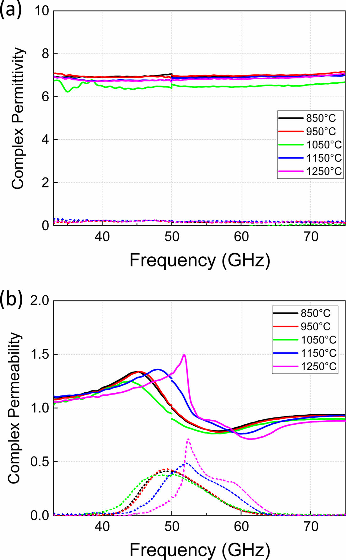 전자파 흡수 성능의 분석을 위한 복소유전율 및 복소투자율은 네트워크 분석기(VNA, N5291A)를 이용하여 강자성 공명이 발생할 것이라 예상되는 Q (33-50 GHz) 및 V (50-75 GHz) band 대역에 대해 자유공간 물질상수법으로 측정하였다.