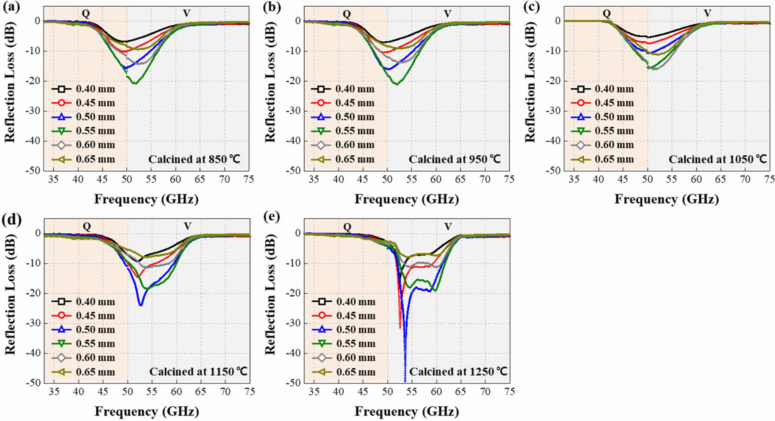 여기서 Zin은 흡수체의 입사 임피던스, Z0는 자유공간에서의 임피던스, er은 복소 유전율(ε'-jε''), μr은 복소 투자율 (μ'-jμ''), f는 입사되는 전자기파의 주파수, c는 빛의 속도, d는 시료의 두께를 나타낸다. 위의 식 (1)과 식 (2)에 따르면 Zin과 Z0가 같아지는 지점, 즉 Zin/Z0가 1에 가까워질수록 반사손실은 큰 음의 값을 가지고 이는 전자파의 흡수가 더 많이 일어남을 의미한다. 또한 식 (1)에서 보듯이 Zin/Z0의 경우 복소 유전율 및 복소 투자율 이외에 두께에 의해 상대적인 크기가 변할 수 있기 때문에 우수한 전자기파 흡수능을 위해서는 전자기적 물성과 두께의 정합을 맞추는 것이 매우 중요하다. 본 연구에서는 시료의 두께를 0.4 mm부터 0.65 mm까지의 두께 범위에서 0.05 mm의 간격으로 각 샘플들의 반사손실을 계산하였다. 그 결과 모든 계산된 두께 범위에서 강자성 공명에 의한 자성손실 주파수 대역과 동일한 약 52 GHz 주파수에서 높은 반사손실에 의한 peak을 확인할 수 있었다. 이는 M형 페라이트의 전기적 특성과 앞서 측정된 복소 유전율 및 투자율 결과를 통해 예측할 수 있다. 기본적으로 M형 페라이트는 전기전도도가 낮은 산화물이기 때문에 도전손실이 거의 없고 따라서 M형 페라이트의 전자파 흡수 기구는 주파수에 따른 유전손실 또는 자성손실에 의해 나타난다고 볼 수 있다. Fig. 4에서 볼 수 있듯이 M형 페라이트는 유전율 허수부에 해당하는 유전손실이 거의 없는 반면 강자성 공명으로 발생된 자성손실은 크기 때문에 자성손실이 전자파 흡수의 주요한 메커니즘으로 작용하게 된다. 다시 말하면 본 연구에서 제조된 M형 페라이트 복합재는 자성손실의 주파수와 자성손실의 크기에 의해 M형 페라이트 복합소재의 전체적인 전자파 흡수능이 결정된다고 볼 수 있다. 구체적으로는, 하소 온도가 1050°C 이하의 샘플에서는 0.55 mm, 하소온도가 1150°C 이상인 샘플에서는 0.5 mm에서 가장 우수한 전자파 흡수능을 보여주었다. 특히 1250°C 온도에서 하소된 샘플은 53.6 GHz에서 -49.3 dB의 흡수능을 보여주었으며 52 GHz부터 61.2 GHz까지 9.2 GHz에 걸쳐 90%의 전자파 흡수가 가능한 광대역 전자파 흡수 특성이 얻어졌다. 따라서 수십 GHz 주파수 대역에서 강한 강자성 공명에 의한 자성손실이 존재하는 M형 페라이트 복합재는 향후 밀리미터파 대역에서 우수한 전자파 흡수능을 구현할 수 있는 후보 소재라 생각된다.