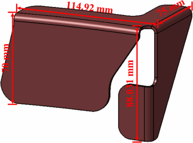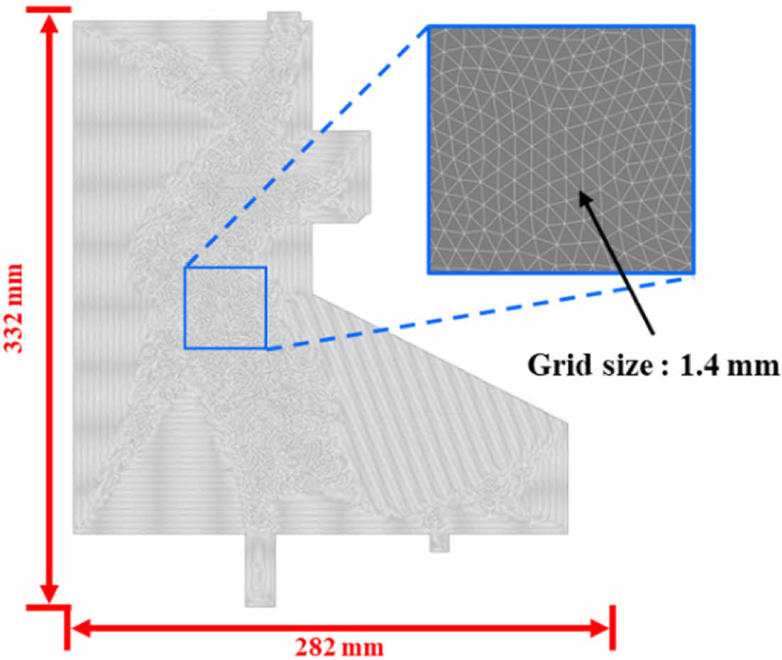 Blank는 고속 열 성형 공정에서 제품을 도출할 때 소모되는 재료로써, 최종 제품을 제작하는데 Blank 크기와 형상이 중요한 영향을 미친다. 또한, 손실되는 재료의 양을 최소화할 수 있는 형상으로 고려되어야 하며, 이를 위해 고속 열 성형 해석을 통해 Blank size와 공정 변수를 도출하고자 하였다. 고속 열 성형 해석은 상용 유한요소해석 소프트웨어인 Aniform (ver. 4.0.2)을 통해 수행하였다. Blank 형상은 Parameter 연구를 통해 소재 손실을 최소화하면서 원하는 제품 형상을 얻을 수 있는 Size로 선정하였다. 유한요소모델은 Blank의 형상을 고려하여 모델링하였고, Fig. 2에 나타내었다. Element 형상은 2D triangular element로 구성하였고, Grid size는 1.4 mm로 설정하였다.