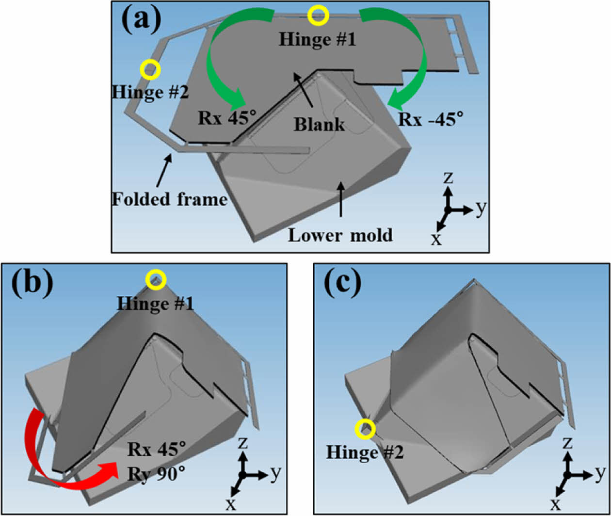 Fig. 3 Process of blank rotation for stamp forming simulation: (a) Set-up before folding the hinge, (b) First folding by hinge, (c) Second folding by hinge |