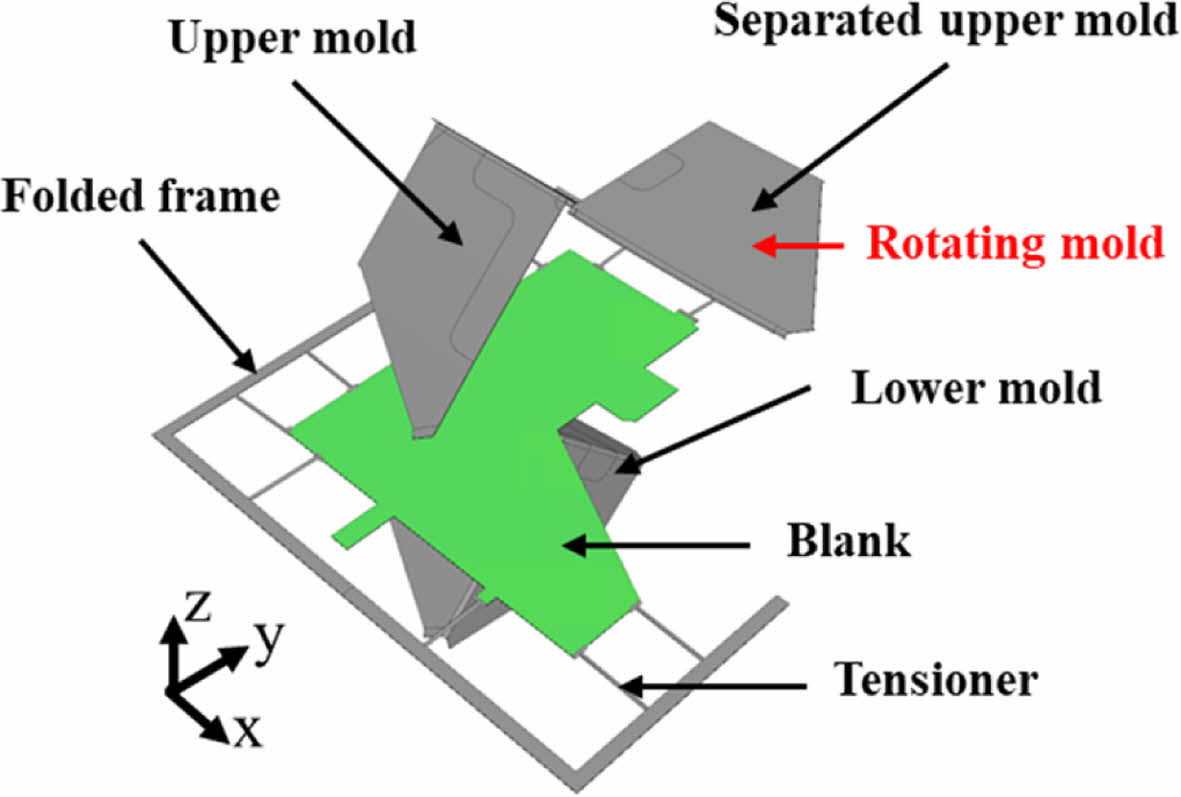 로봇 암을 이용한 Blank 접힘을 구현하기 위해 Blank가 체결된 Folded frame의 회전을 설정하였다. Blank와 Folded frame 그리고 금형이 서로 간섭이 일어나지 않게 설계하였고, Folded frame의 회전축, 각도, 방향을 입력하였다. Folded frame의 원점 좌표 및 회전축(Rx, Ry, Rz)은 xy평면 상에서만 설정이 가능하며, Fig. 3에서 로봇 암의 움직임을 구현하기 위한 고속 열 성형 해석 순서를 나타내었다. 첫 번째 접힘이 발생하는 영역인 Hinge #1을 Rx 기준으로 +45°와 -45°로 회전을 부여한다. 이후 두 번째 접힘이 발생하는 영역인 Hinge #2는 Rx 기준으로 +45°와 Ry 기준으로 +90°로 회전을 부여하여 유한요소해석 내에서 로봇 암을 활용한 Blank 접힘 현상을 구현하였다. 로봇 암 거동을 적용한 고속 열 성형 해석 모델을 Fig. 4에 나타내었다.