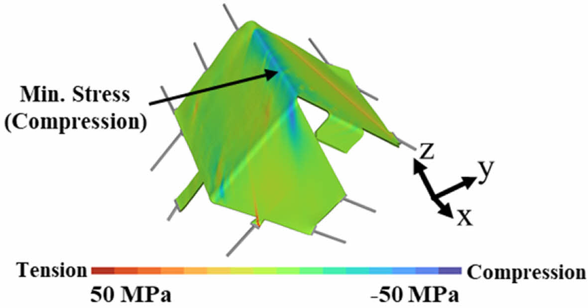 Fig. 5는 FEM을 통해 고속 열 성형 공정 중 Double folded clip에 발생하는 응력 분포를 나타내었다. 해석 결과 Blank가 접히는 영역에서 가장 큰 압축 응력이 발생했다. 이는 기하학적 형상으로 인해 장력이 충분히 가해지지 않고, 공정 중 발생하는 면내방향 응력[21]에 의해 해당 영역에서 압축응력이 나타난 것으로 판단된다. 그러나 해당 응력의 경우 소재 자체의 압축강도보다 낮으므로, FEM으로 구현한 공정 조건은 소재의 구조건전성에 영향이 미미한 것으로 판단하였다.