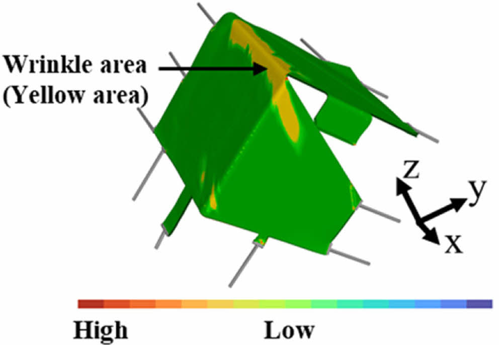 복합재에 주름이 발생할 경우, 복합재 구조에 응력집중을 유발할 수 있다[22]. 이에 따라 고속 열 성형 공정 시 주름을 최소화할 수 있는 공정 조건 수립이 필수적이다. 고속 열 성형 해석에서는 섬유에 가해지는 하중과 두께 변형 등에 각각 1의 가중치를 두고 주름 발생 위험도를 예측한다. 이를 통해 유한요소해석을 통해 도출된 주름이 예측되는 영역을 Fig. 6과 같이 나타내었다. 해당 주름 분포의 경우, 고속 열 성형 중 해당 영역에 Tensioner의 충분한 장력이 작용하지 않아 균일한 인장력을 받지 못하여 발생하였다고 판단하였다. 또한 복합 재의 섬유가 충분한 장력을 받지 못함에 따라 압축 응력으로 인한 굽힘이 유발되어 주름이 발생하였으며, 곡면이 있는 형상과 같이 면내 전단 변형이 큰 경우 주름 발생 위험도가 높은 것으로 확인하였다[23,24].