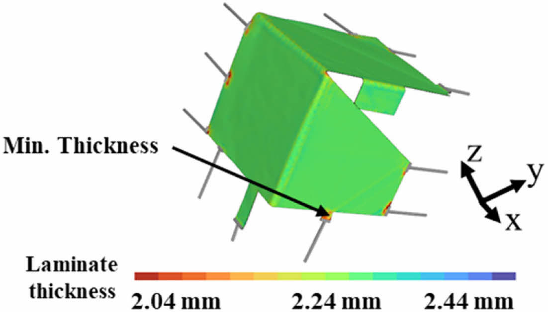 Fig. 7 Results of stamp forming analysis: Thickness distributions |