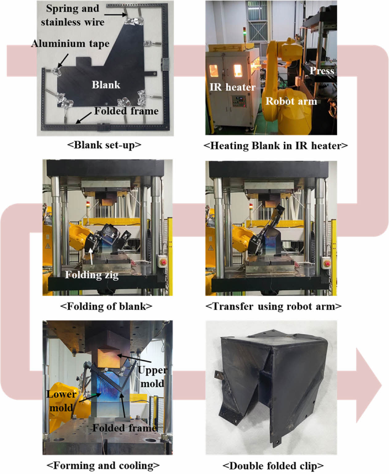 본 연구에서는 Staubli 社 TX200 모델의 다관절 로봇 암을 이용하여 IR heater와 Press 장비를 연동한 고속 열 성형 공정을 진행하였다. 고속 열 성형 해석에서 획득한 Blank 형상으로 공정용 RTL을 가공하였으며, 장력을 부여하기 위해 Tensioner를 이용하여 Blank를 Folded frame에 체결하였다. 로봇 암을 활용해 Folded frame에 고정된 Blank를 IR heater 내부에 위치시킨 후 수지의 녹는점 이상의 350oC까지 승온 후 1분간 유지한다. Blank의 가열이 완료된 시점에서 30초 이내에 로봇 암을 이용하여 Blank를 225oC로 예열된 금형으로 경사이송한다. 그리고 각 위치에서 Folded frame을 접은 후 60 bar의 압력으로 130초간 가압을 진행하였다. 탈형 온도는 성형된 복합재의 열변형을 최소화하기 위해 유리전이온도 이하로 선정하였다. 고속 열 성형 공정 순서와 성형 Cycle은 Fig. 9와 10에 각각 나타내었다.