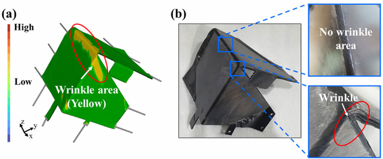 제작된 열가소성 복합재 구조의 성형성을 평가하기 위해 Fig. 11과 같이 성형 중 발생한 주름을 유한요소해석 결과와 비교하였다.