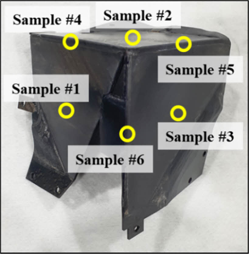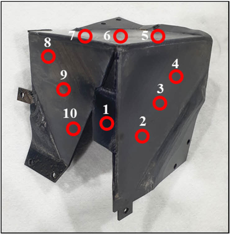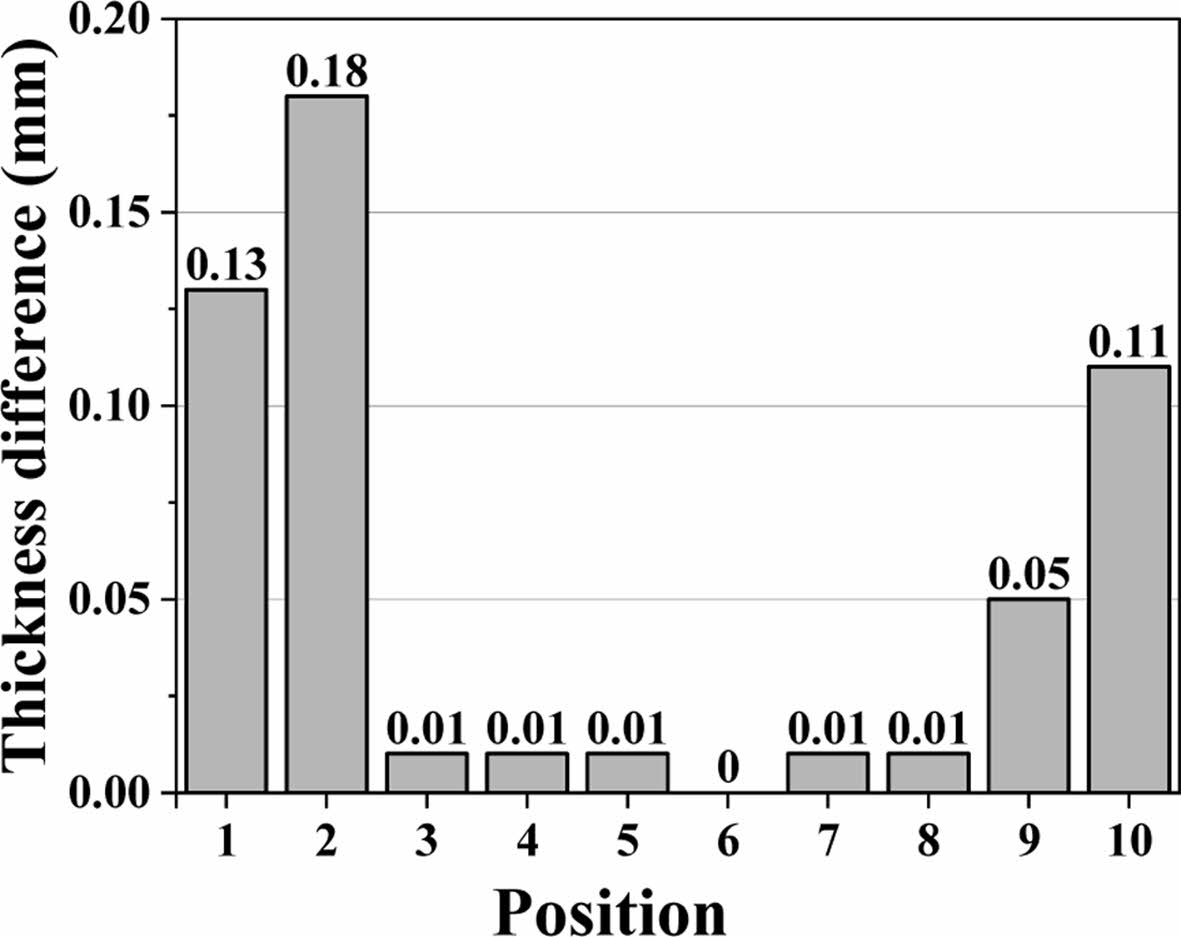 고속 열 성형 공정으로 제작된 복합재의 두께를 측정하기 위해 Fig. 12와 같이 측정 지점을 선정하여 두께를 측정하였다. 본 연구에서 사용한 소재인 AS4D LMPAEK RTL의 성형 전 두께 2.24 mm를 기준으로 성형 후 두께를 측정해 두께 차이를 통한 균일성을 평가하였고, 두께 측정 결과는 Fig. 13에 나타내었다. 평균 오차율과 최대 오차율은 2.23%, 8.03%로 도출되었다. 이는 유한요소해석과는 달리 실제 공정에서는 로봇 암과 프레스 간의 간섭을 피하기 위해 로봇 암의 이동 범위 제약이 있어 충분한 압력과 장력이 제공되지 않은 결과로 판단된다.