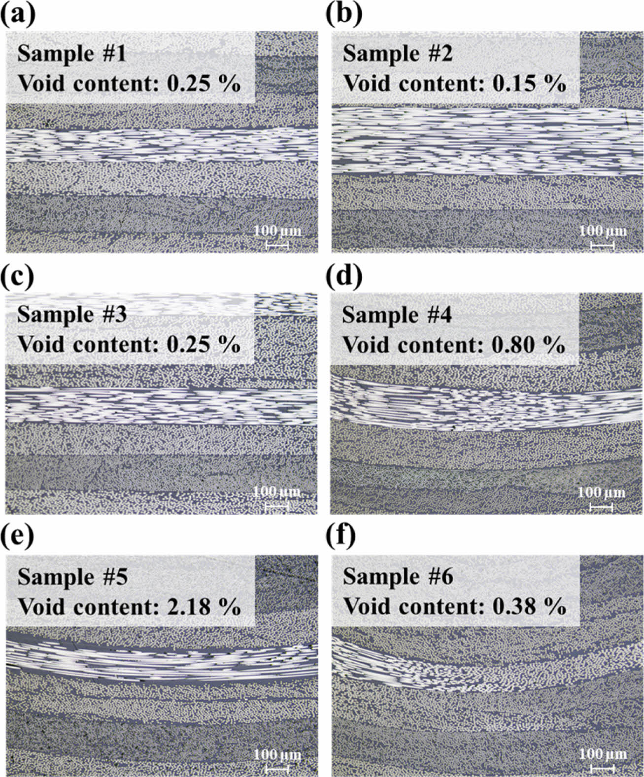 Fig. 15 Cross-section micrographs of double folded clip: (a) Void content of Sample #1 on planar area, (b) Void content of Sample #2 on planar area, (c) Void content of Sample #3 on planar area, (d) Void content of Sample #4 on curvature area, (e) Void content of Sample #5 on curvature area, (f) Void content of Sample #6 on curvature area |