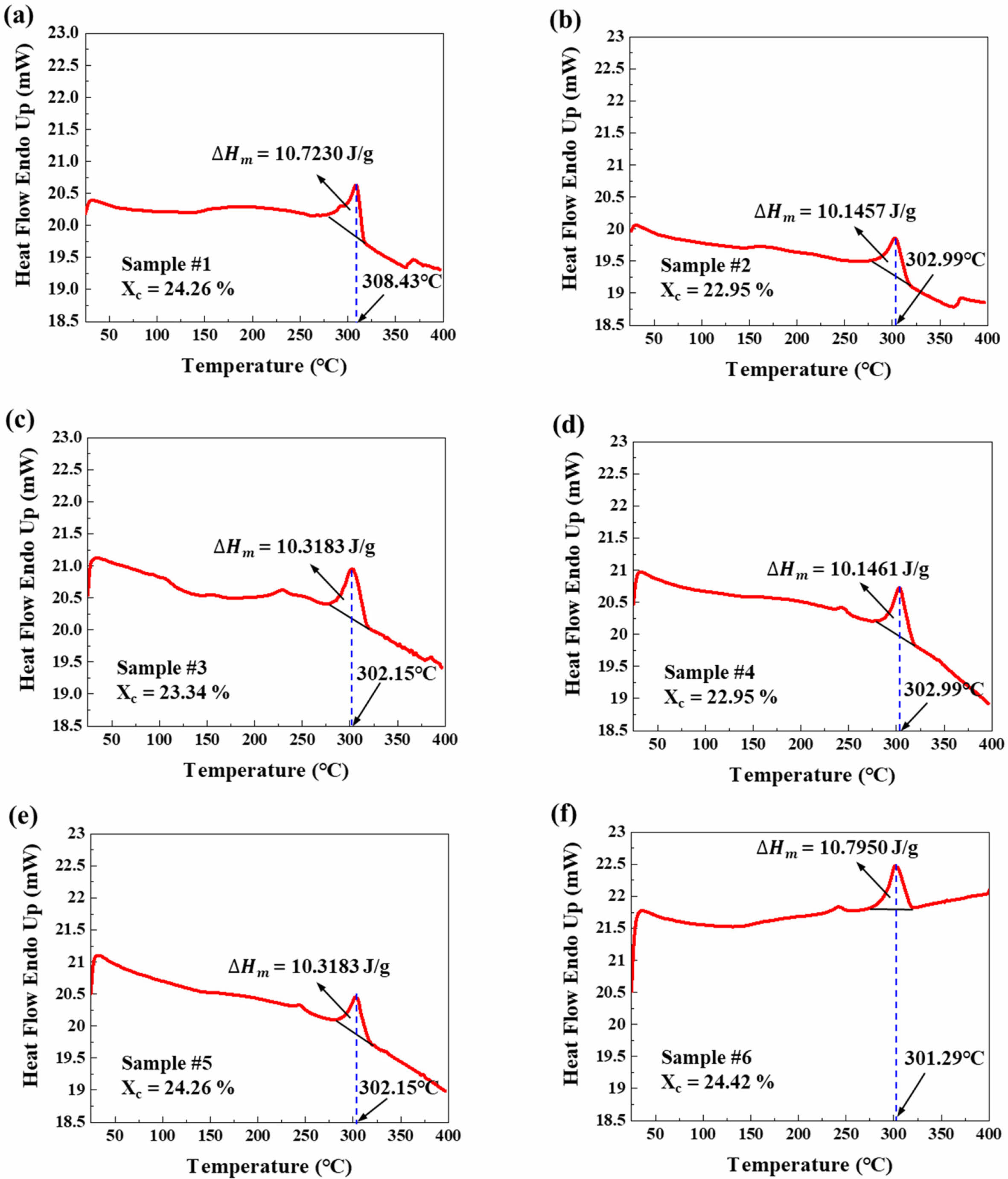 Fig. 16 DSC results of double folded clip: (a) DSC graph of Sample #1 on planar area, (b) DSC graph of Sample #2 on planar area, (c) DSC graph of Sample #3 on planar area, (d) DSC graph of Sample #4 on curvature area, (e) DSC graph of Sample #5 on curvature area, (f) DSC graph of Sample #6 on curvature area |
