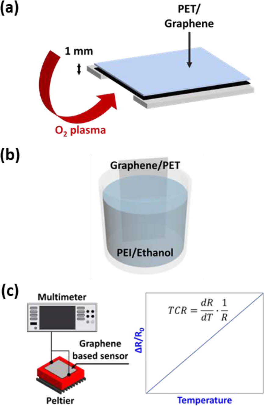 Fig. 1 (a, b) Schematic of the sample preparation. (a) Oxygen plasma treatment. (b) Dip coating process. (c) Characterization of graphene temperature sensors by controlling temperature with Peltier and measuring the resistance change of graphene with a multimeter |