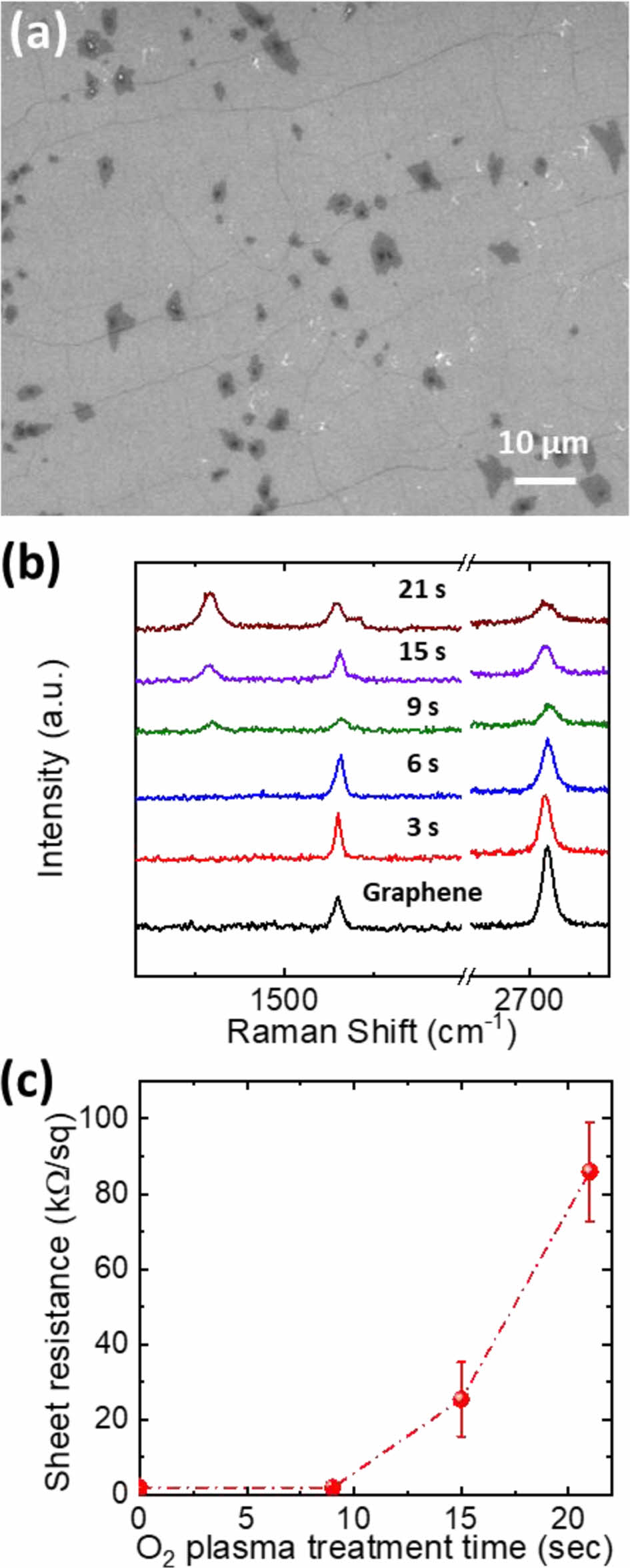 Fig. 2 (a) SEM image of CVD-grown monolayer graphene transferred on SiO2/Si. (b) Raman spectra of CVD-grown monolayer graphene according to O2 plasma treatment time. (c) Sheet resistance change according to O2 plasma treatment time |