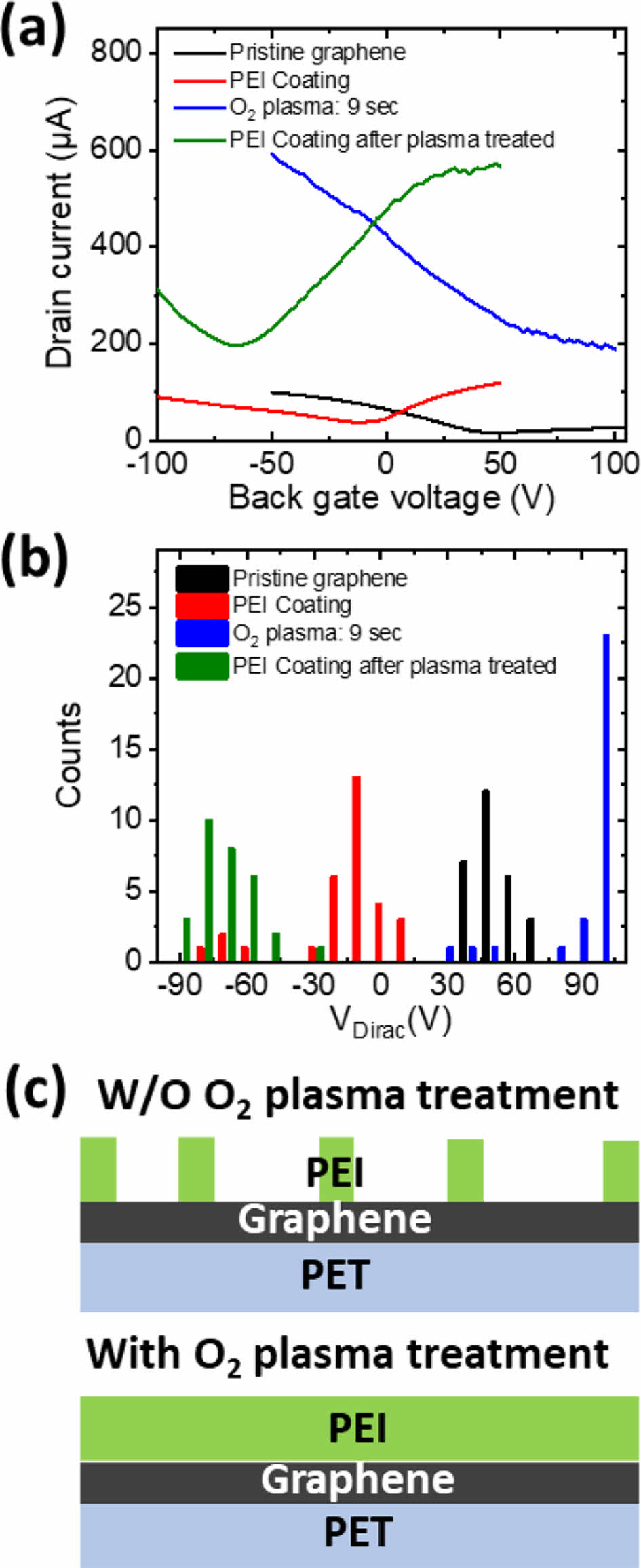Fig. 3 (a) Current-voltage curves of graphene FETs before and after surface treatments. (b) Distribution of Dirac point voltages of graphene FETs. (c) Schematic of PEI-coated graphene surfaces with or without the oxygen plasma treatment |