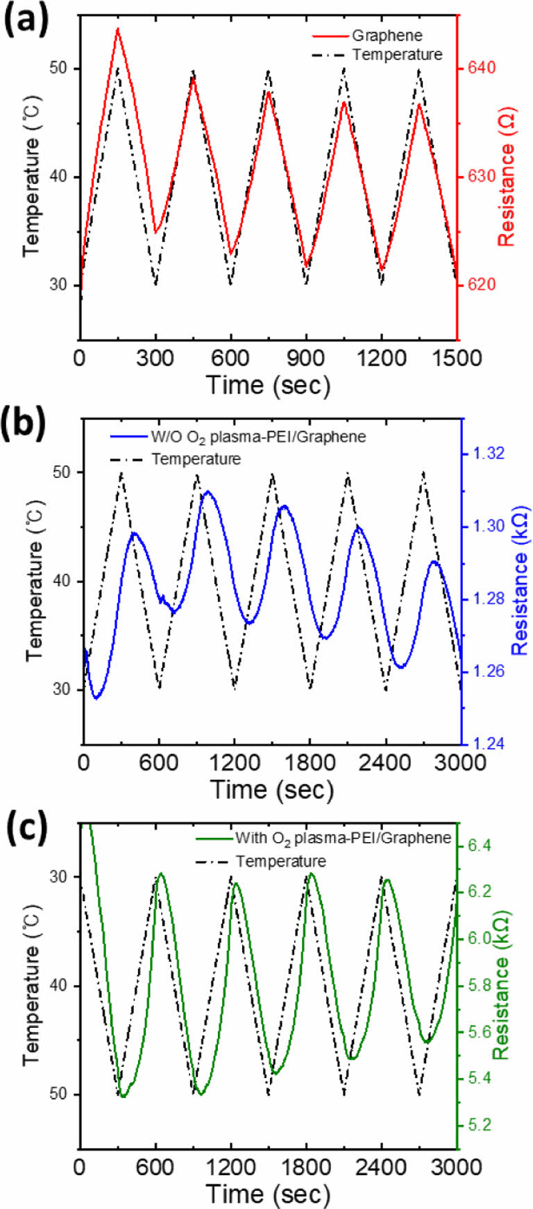 Fig. 4 Resistance change of CVD-grown monolayer graphene as a function of temperature change over time: (a) pristine graphene, (b) PEI-coated graphene without the oxygen plasma treatment, and (c) PEI-coated graphene with the oxygen plasma treatment |