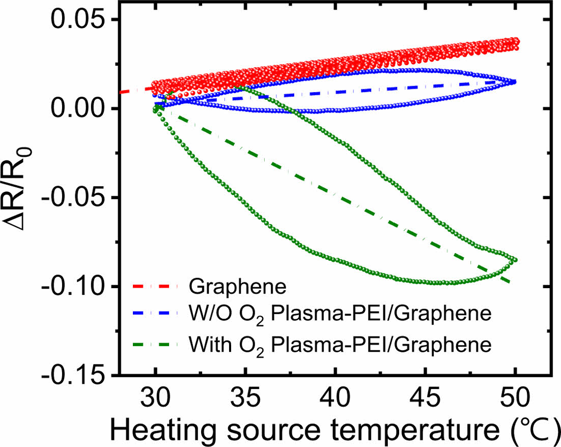 또한 산소 플라즈마 표면 처리 후 PEI를 코팅한 그래핀에 대해, 가열과 냉각을 반복하여 열적인 히스테리시스(hysteresis)를 관찰하였다. 이는 온도-저항 곡선에서 │AH-AC│/AH로 정량화 할 수 있는데, 여기서 AH와 AC는 온도-저항 곡선에서 가열될 때와 냉각될 때의 곡선 아래 면적을 각각 나타낸다. PEI가 코팅된 그래핀의 경우 36.0(±3.8%)로 상대적으로 낮은 선형성을 보였다. 이는 코팅된 PEI의 낮은 열전도도 및 두께로 인한 영향으로 보이며 낮은 농도의 PEI 코팅을 통해 두께를 얇게 제어하면 선형성은 개선될 것으로 생각된다.