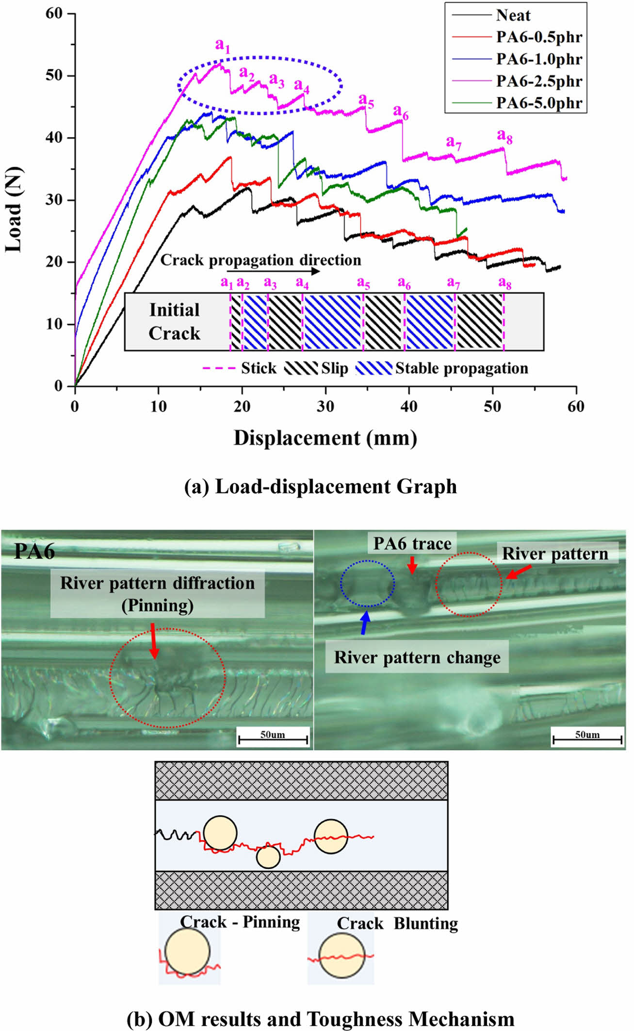 Fig. 2 The results of (a) Load-displacement and (b) Optical microscope, Toughness mechanism of p-PA6 modified CFRP |