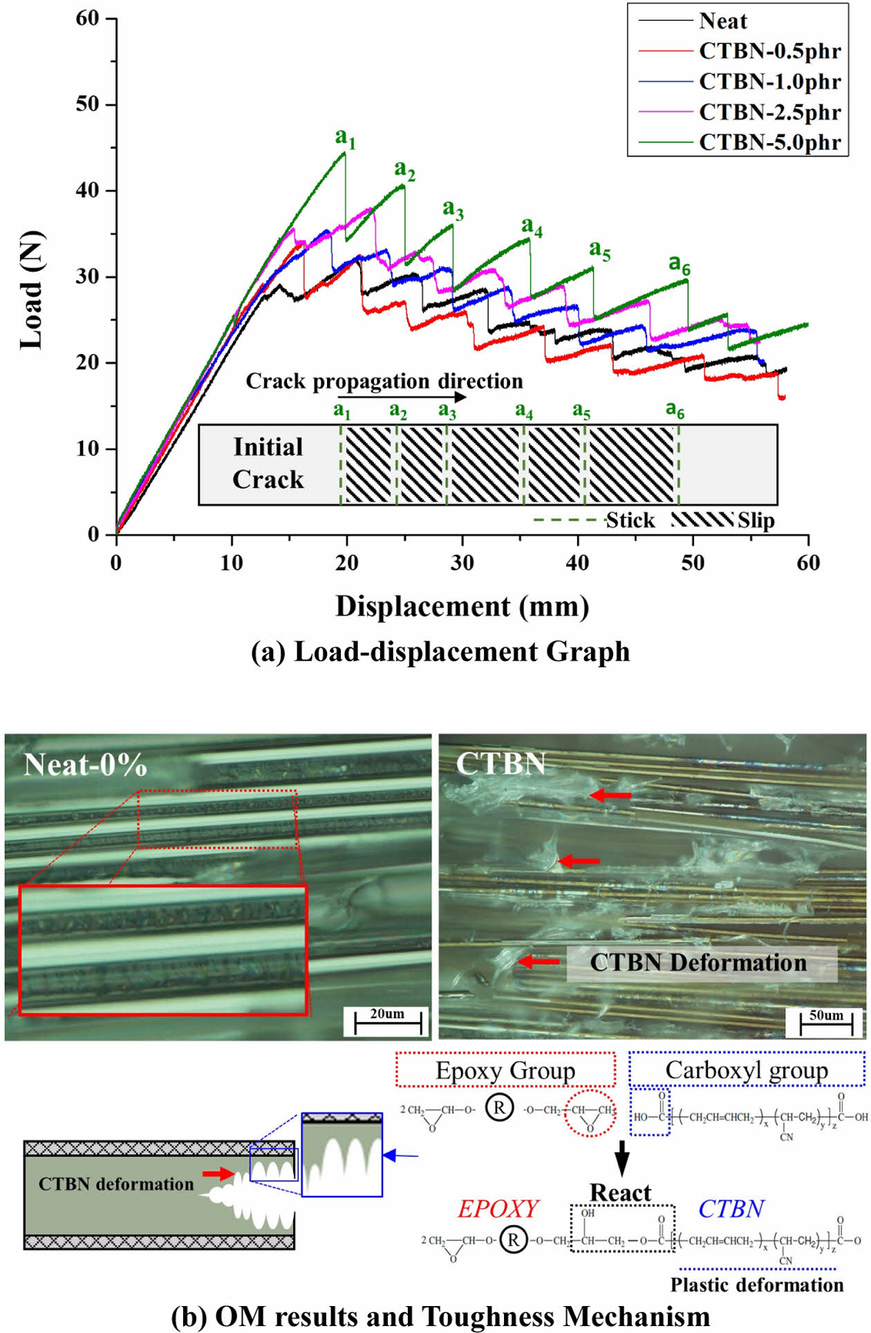 Fig. 3 The results of (a) Load-displacement and (b) Optical microscope, Toughness mechanism of CTBN modified CFRP |