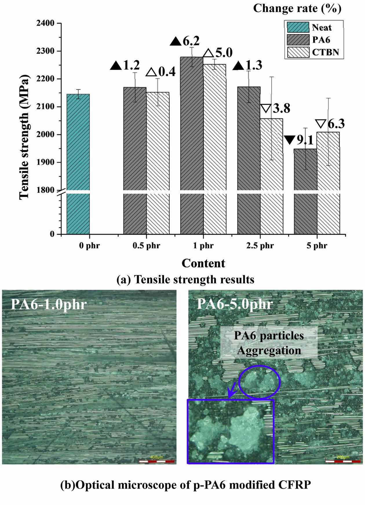 Fig. 4 The results of (a) Tensile properties and (b) Optical microscope, p-PA6 aggregation in PA6 modified CFRP |