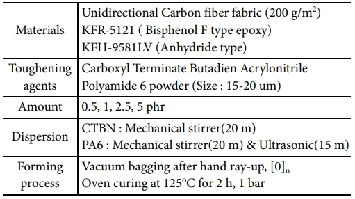 Keywords: CFRP, 나일론6 입자(PA6 particles), 액상 고무첨가제(CTBN elastomer), 파괴인성 분석(Facture toughness analysis)