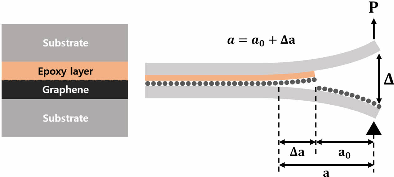 모드 1 시험을 적용하여 그래핀과 기판의 접착에너지를 측정하기 위해 이중외팔보(double cantilever beam, DCB) 형태의 시편을 제작하였다. 기판을 아세톤, 에탄올, 초순수를 이용하여 초음파 세척하고, 기판에 에폭시 접착제를 도포한 뒤, 단일층 그래핀이 전사된 기판을 접합하여 DCB 시편을 제작하였다. 알루미늄 로딩 탭이 부착된 기판의 끝단을 에폭시 없이 두어 초기 크랙을 형성하였으며, 이를 Fig. 1에 나타내었다[21]. 인장시험기를 이용하여, Fig. 1과 같이 DCB 시편의 끝단에 5 mm/min의 속도로 변위를 인가하여 그래핀을 기판에서 박리하였다[22].
