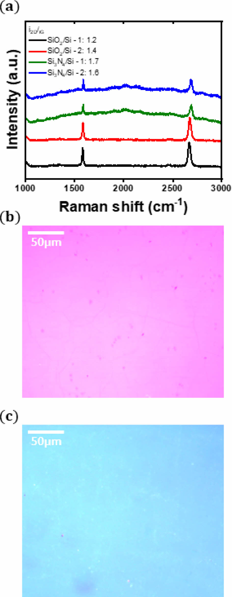 Fig. 2 Graphene transferred on dielectric substrates. (a) Raman spectra of graphene. (b, c) Photographs of (b) silicon dioxide and (c) silicon nitride samples |