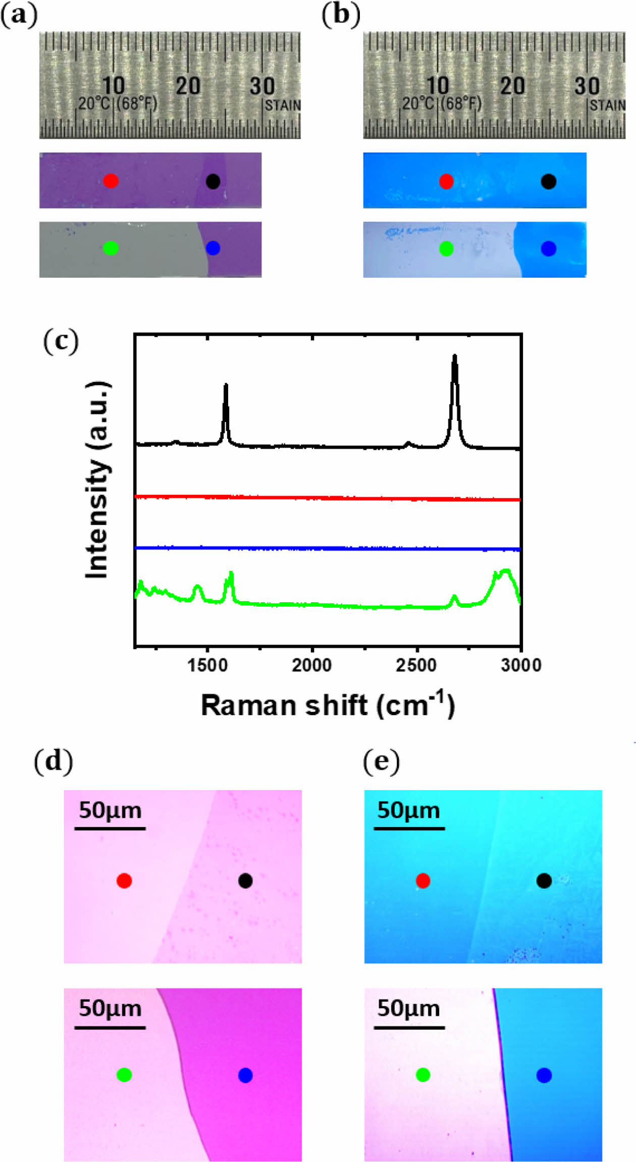 모드 I 시험 후, 한 쪽 기판 위에 올려졌던 기판이 에폭시를 통해 다른 쪽 기판에 완전히 전사되었는지 확인하였다. Fig. 3(a, b)는 시험 후, 두 기판의 광학 이미지로, 상단 기판은 처음에 그래핀이 전사되었던 기판이며, 하단 기판은 에폭시가 코팅되어 시험 후 그래핀이 에폭시에 전사된 기판이다. 상단 기판의 빨간색 점으로 표시된 부분에서 그래핀이 박리되어 하단 기판의 초록색 점 부분인 에폭시 영역에 완전히 전사되었다. 이에 따라, Fig. 3(c)의 라만 스펙트럼을 살펴봤을 때, 빨간색 점 부분에서는 라만 신호가 없지만, 초록색 점 부분에서는 그래핀을 나타내는 G 밴드와 2D 밴드가 존재하는 것을 알 수 있다. 반면에 에폭시가 코팅되지 않았던 시편의 끝부분(검은색 점 부분)은 그래핀이 그대로 존재하기 때문에 상단 기판에서 그래핀의 라만 스펙트럼을 확인할 수 있고, 하단 기판의 파란색 부분에서는 그래핀이 존재하지 않게 된다. Fig. 3(d, e)는 광학현미경으로 확대하여 관찰한 표면으로 빨간색과 검은색 부분을 통해 그래핀 유무에 따른 색 차이를 확인할 수 있다. 따라서, DCB 시편을 이용한 모드 I 시험을 통해서 대면적 그래핀이 완전히 박리되어 에폭시에 전사된 것을 확인할 수 있다.