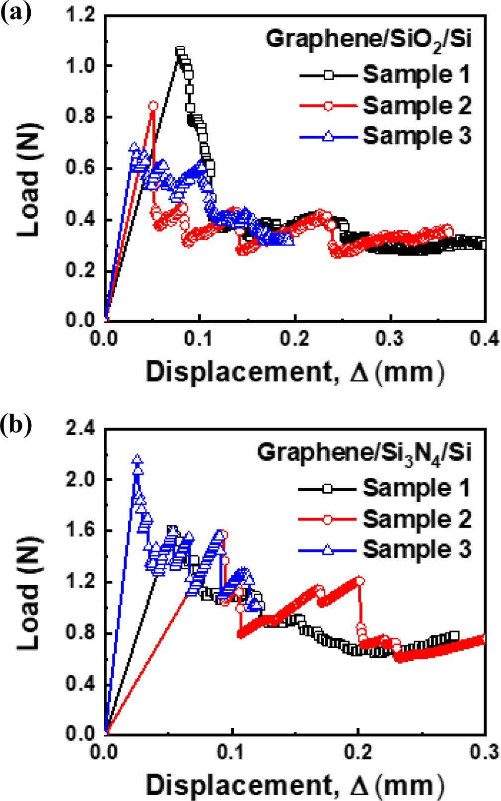 Fig. 4는 산화실리콘 기판과 질화실리콘 기판에 전사된 단일층 그래핀에 대하여, 모드 I 시험에 따른 힘-변위 그래프를 나타낸다. DCB 시편의 끝단에 변위가 인가됨에 따라 하중이 선형적으로 증가하며, 크랙이 발생하고 기판을 따라 전파됨에 따라 하중이 급격히 낮아지게 된다[21]. 힘-변위 그래프에서 하중이 반복적으로 증가/감소하는 stick-slip 현상이 관찰되는데, 이는 크랙의 불안정한 전파에 따른 것으로 알려져 있다[17,39]. 또한, 측정 신뢰성을 확보하기 위하여, 모드 I 시험 후, 완전한 계면 박리가 일어나는 시편에 대해서 데이터를 수집하였다.