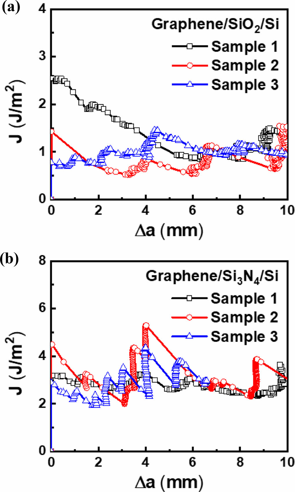 Fig. 5 Fracture resistance curves for graphene placed on (a) silicon dioxide and (b) silicon nitride |