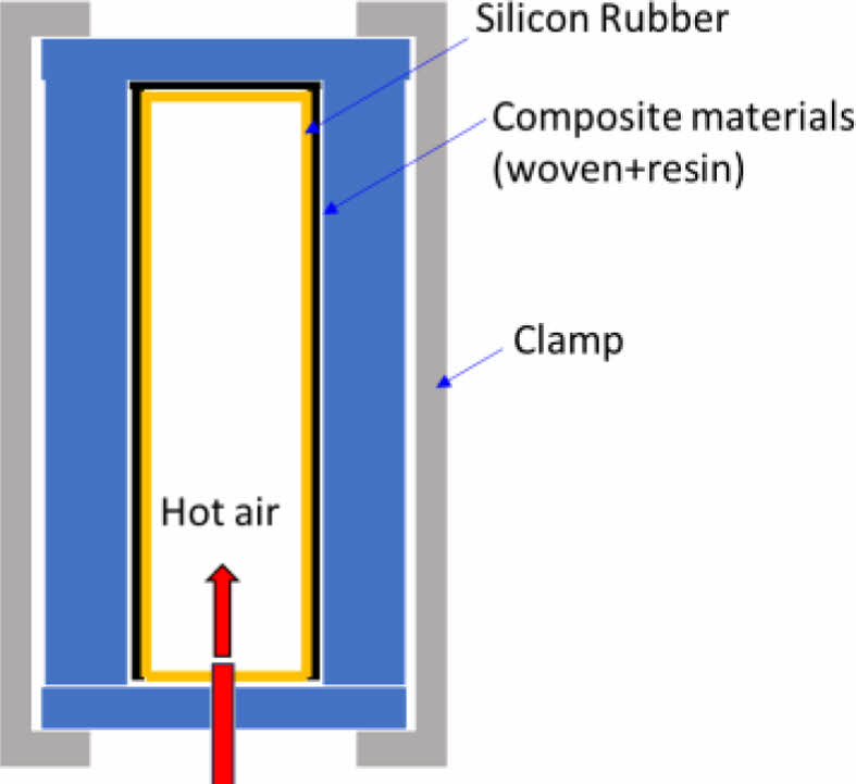 복합재료의 제조로 진공백 성형공정(vacuum bag molding)을 이용하였다. 공정상 특이사항은 실리콘 고무를 이용하여 진공을 잡았다는 점이며, 고무 외부에서 공기압을 가하여 복합재료 시편에 압력이 전달되는 형태로 공정을 구축하였다. 또한 시편을 제조하기 위해 진공백 내부에 수지를 모두 주입하여 제품을 제조하였다는 측면에서 새로운 공정을 적용되었다고 볼 수 있다. 궁극적으로 건축용으로 사용되기 위한 복합재료의 제품을 제조하여 동적굴곡피로실험을 실시하였고, 그에 따른 복합재료 제조 과정은 Fig. 1과 같다. 시편에 가해지는 가압공정을 안정적으로 하기 위해 공기압을 가했으며, 내부에 가해지는 압력이 균일하게 1 bar의 압력이 가해지도록 설정하였다. 수지의 경화를 위해 온도는 80°C의 공기를 주입하였다.