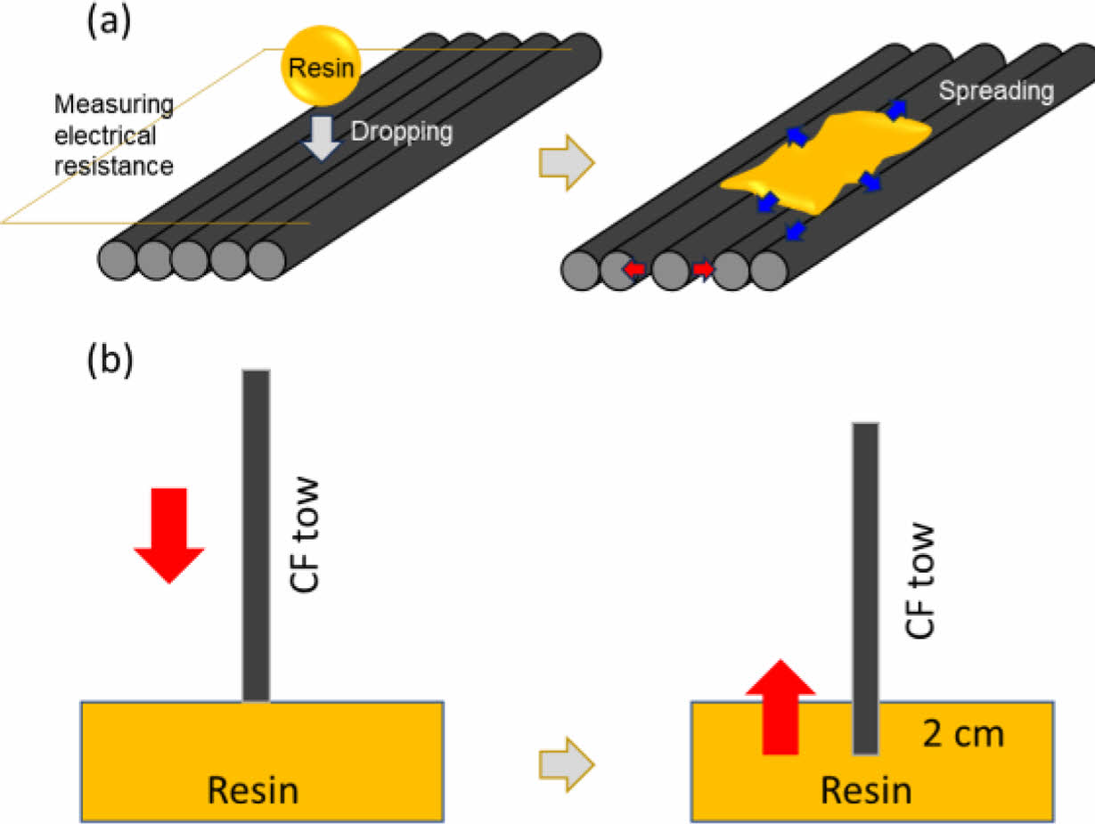 Fig. 2 Schematic of resin impregnation evaluation methods: (a) resin impregnation evaluation technique using electrical resistance measurement; (b) resin seepage weight detection technique by impregnating fibers with resin. |