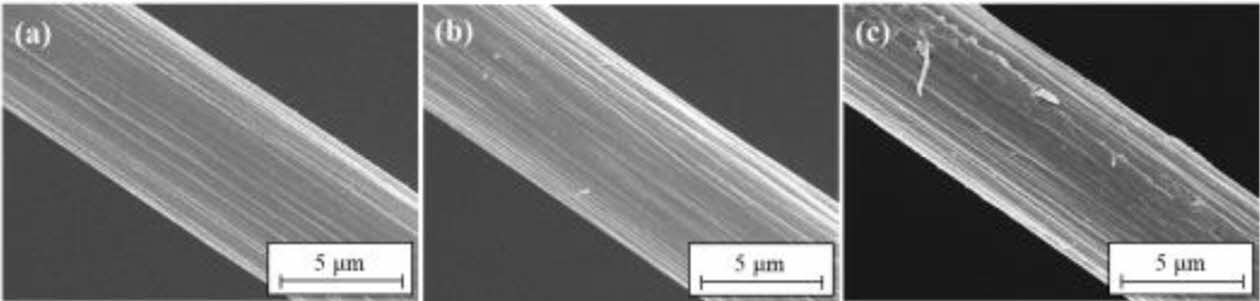 Fig. 3 Changes in surface morphology as a function of plasma treatment time on fibers: (a) neat; (b) 1 min; and (c) 5 min |