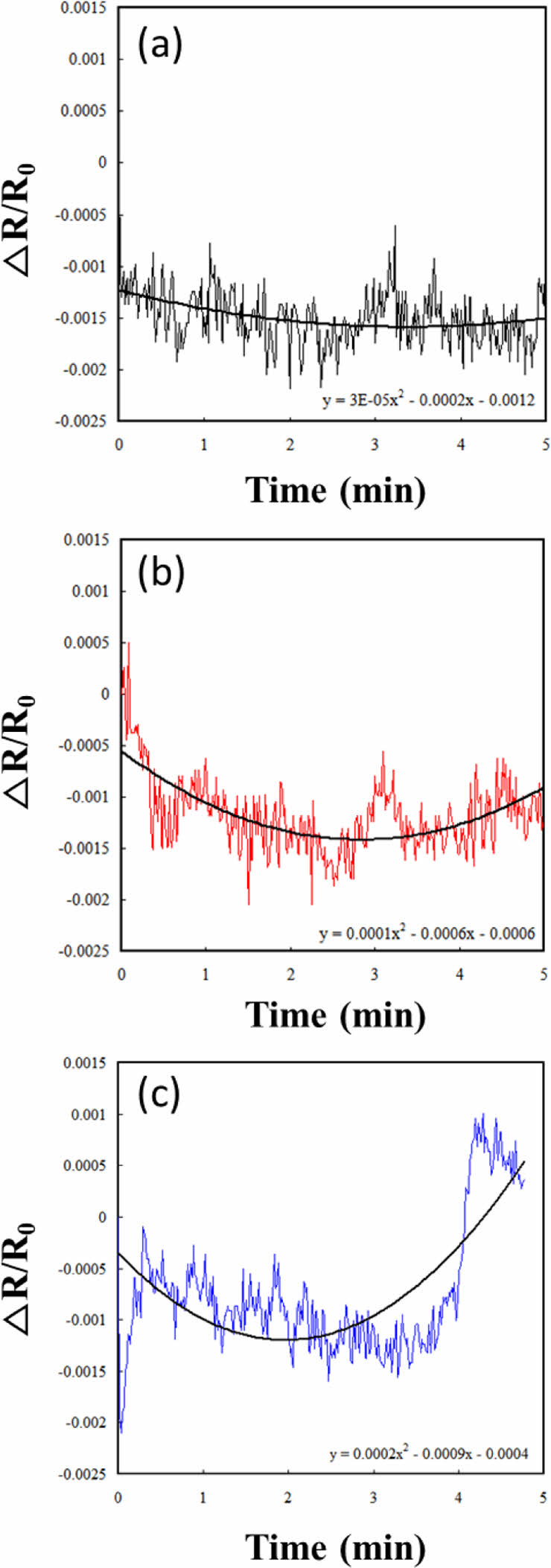 Fig. 4 Results of real-time evaluation of the impregnation status of the resin using electrical resistance measurements: plasma treatment time (a) 0 min; (b) 1 min; and (c) 5 min |