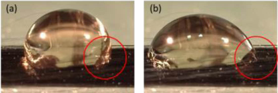 Fig. 5 RResin impregnation of fibers after 5 min of plasma treatment: (a) Contact angle at 0 min, (b) Contact angle at 0.5 min |