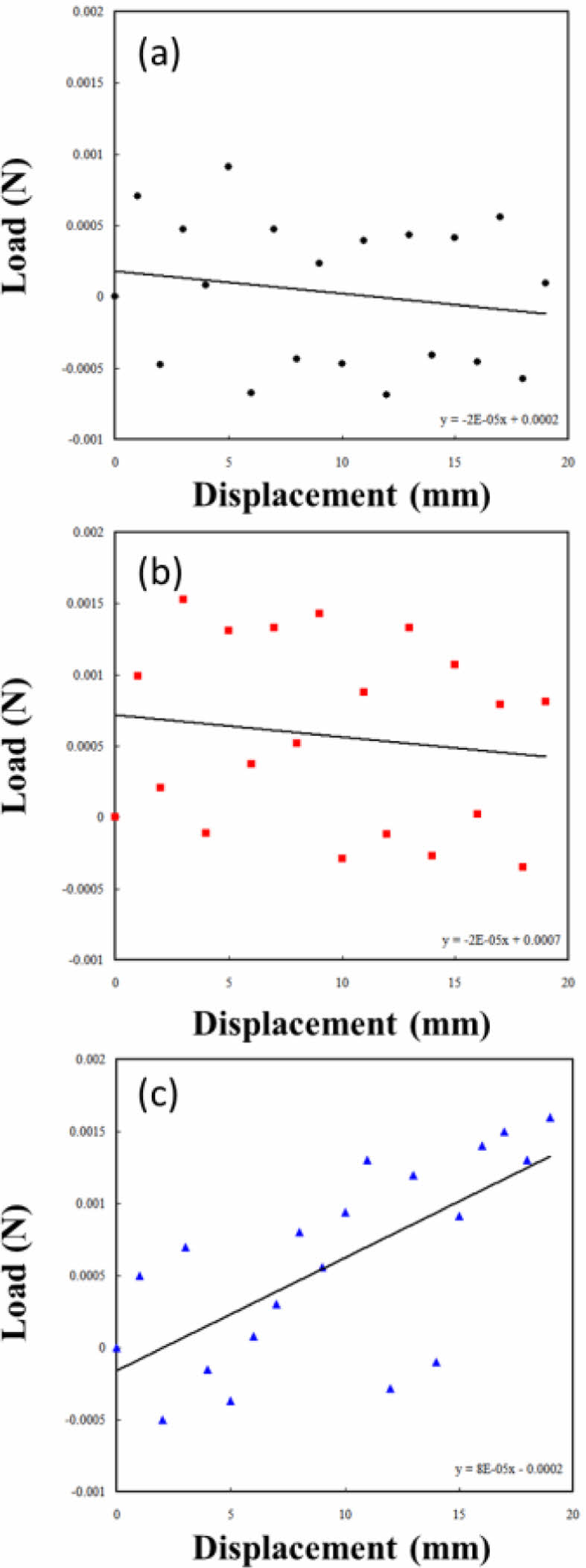 실질적으로 섬유를 수지에 딥핑할 때, 섬유 토우 내로 함침되는 수지의 하중 값을 측정한 결과를 Fig. 6에 제시하였다. Fig. 6과 같이 섬유가 수지로 딥핑 될 때 발생되는 섬유 토우 내로 수지가 함침되는 정도를 하중으로 측정할 수 있었다. Fig. 6(a)와 같이 섬유에 아무런 처리를 하지 않았을 경우 초기에는 수지가 섬유토우에 함침되지만, 지속적으로 수지가 섬유 토우 내에 존재하지 못하고 빠지는 듯하게 하중 값이 저하되는 결과를 확인하였다. 그에 비해 Fig. 6(b)의 경우 섬유 토우 내에 스며든 수지의 함량은 변위가 20 mm 수준일 때 0.0008 N 수준으로 초기보다는 8배 증가된 결과이지만, 지속적으로 수지의 함량이 저하되는 경향은 아무런 처리를 하지 않은 조건과 유사하였다. 마지막으로 Fig. 6(c)의 경우 지속적으로 토우 내로 수지가 함침되었음을 예측할 수 있다.