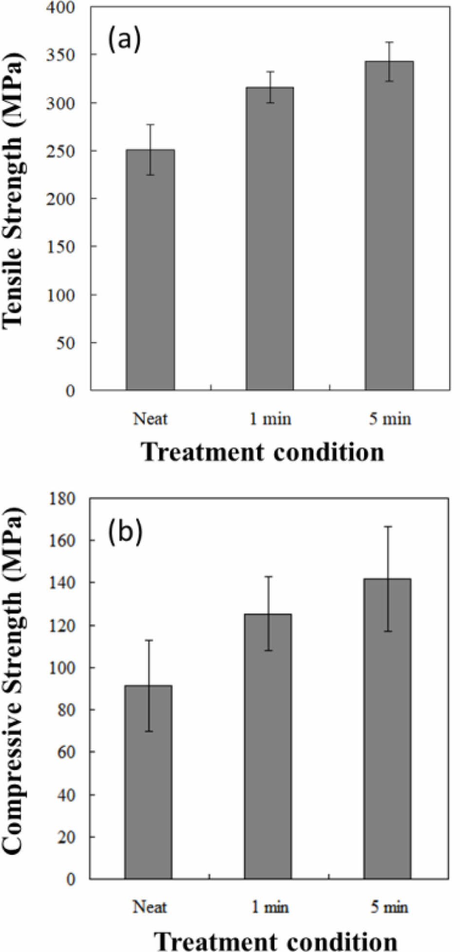 Fig. 7의 경우 복합재료를 제조하였을 때 확인되는 인장강도 및 압축강도의 변화를 정리한 결과이다. 인장강도는 초기의 상태에서 250 MPa 수준이었으나 플라즈마 처리 5분을 한 직물을 이용했을 경우 340 수준까지 증가되었다. 압축강도의 경우 80 MPa 수준의 압축강도를 보이던 일반 복합재료의 물성이 플라즈마 처리에 따라 수지 함침성이 증가되었기 때문에 140 MPa까지 증가되었다. 즉 수지 함침성이 극대화되는 경향을 보인다면, 복합재료의 물성이 증가될 수 있음을 확인하였다.