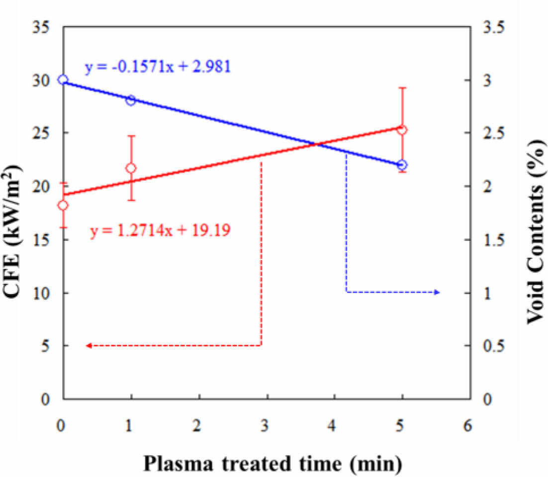Fig. 8 CFE and void content of composites changes with plasma treatment time |