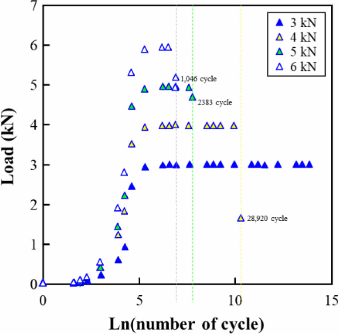 마지막으로 플라즈마 처리 5분을 진행한 섬유 직물을 이용하여 제조한 4 mm 두께의 건축용 복합재료 부품의 일부분을 80 mm × 10 mm로 절단하여 동적피로 굴곡시험을 실시하였다. 3 kN 일 때는 100만회 사이클에도 안정적인 시편의 상태를 나타내었다. 하지만 4 kN 조건에서는 28,920 회 조건, 5 kN에서는 2,383회, 6 kN 조건에서는 1,046회에 피로 내구 특성을 가짐을 확인하였다.