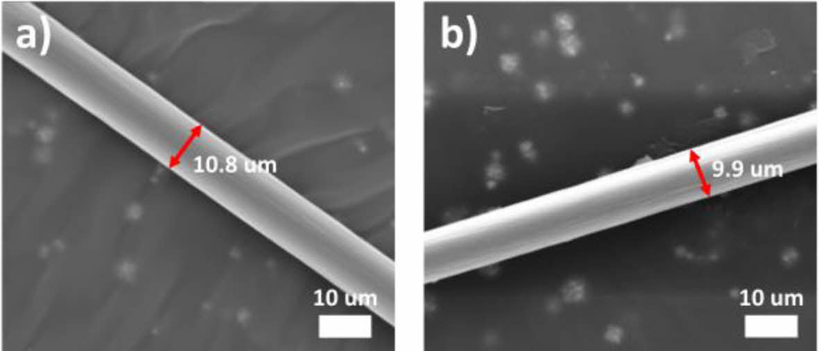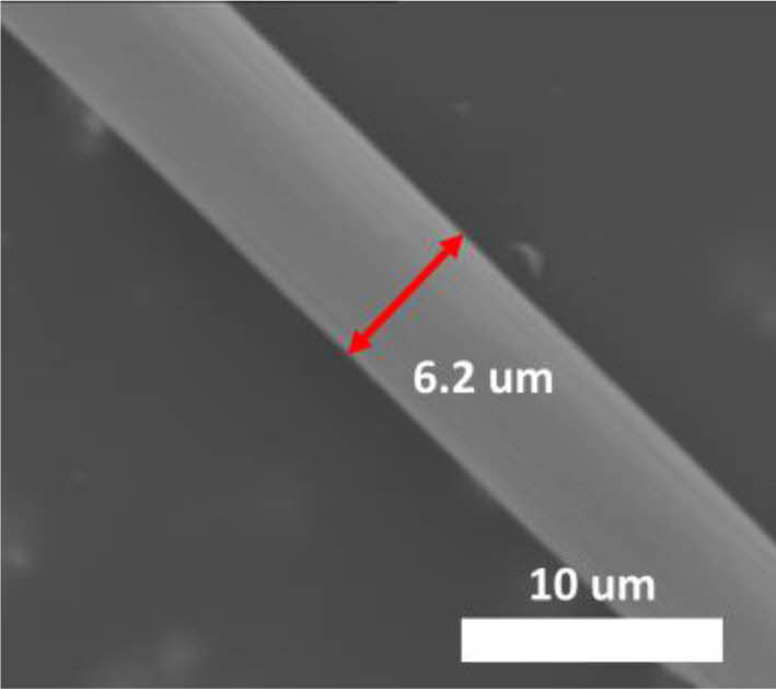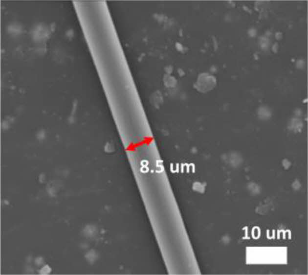 Next, thermal oxidatively stabilized PAN fiber went through carbonization. Carbonization was carried out at the 800°C, resulting in the successful fabrication of carbon fibers with an average diameter of 8.5 µm (Fig. 4).