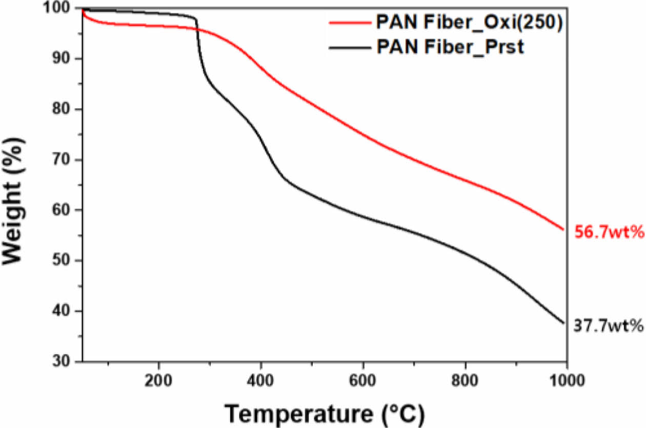 On top of the shrinkage in fiber diameter, TGA results proved successful stabilization via thermal oxidation (Fig. 2). Through TGA, samples went through high temperature heat treatment reaching 1000°C under N₂, which simulated carbonization process. While pristine PAN fiber, whose chemical structure did not contain thermally stable cyclic structure, exhibited final carbon yield of 37.7%, oxidized PAN fiber showed distinguishably improved carbon yield of 56.7%. Such improvement in carbon yield is mainly due to the formation of thermally stable cyclic structure by thermal oxidation.