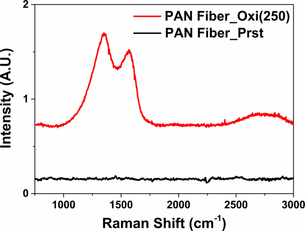 Fig. 3 Raman spectroscopy results of pristine and thermal oxidatively stabilized PAN fibers |