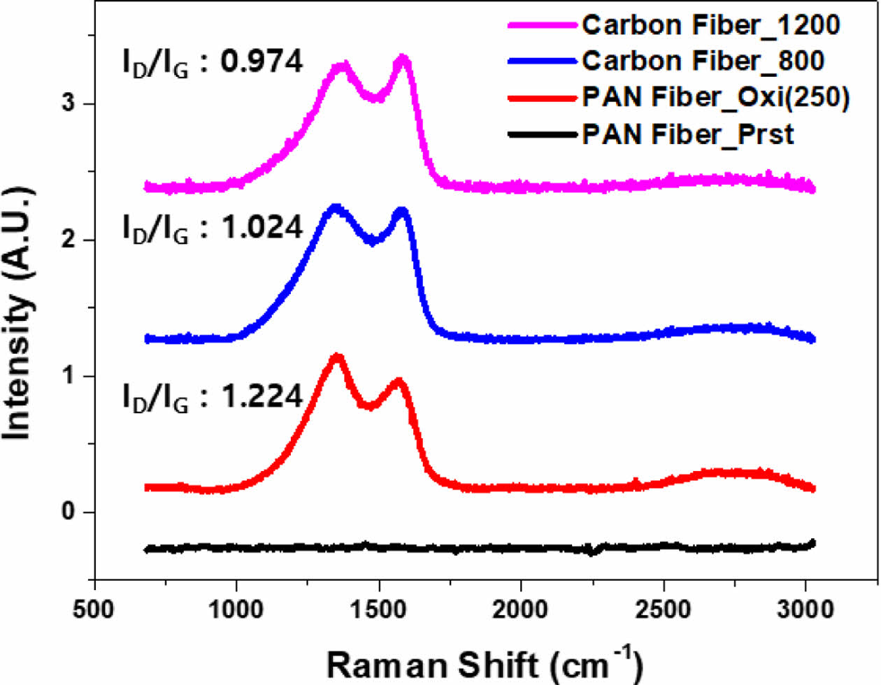 Through Raman spectroscopy analysis, the ID/IG ratio can be obtained, which is the intensity ratio of the D-band and G-band. In typical PAN-based carbon fibers, this ratio is approximately 1, and it decreases as the crystallinity of the carbon structure increases [23]. ID/IG ratio of carbon fiber obtained from 800°C carbonization was 1.024, which indicated the successful fabrication of PAN-based carbon fibers (Fig. 5). Furthermore, with higher-temperature carbonization at 1200°C, the ID/IG ratio decreased from 1.024 to 0.974. This change corresponds to the pattern observed in PAN-based carbon materials [23,24].