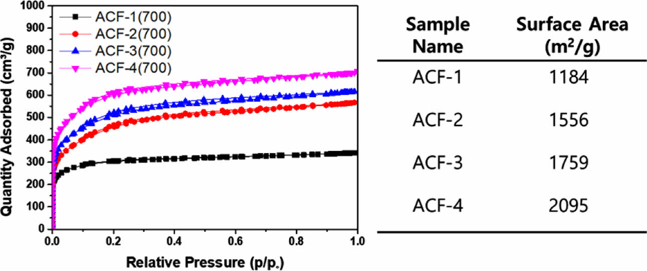 Still, the formation of a microporous structure, which is not easily discernible through SEM images, could be confirmed by analyzing the BET adsorption curves of ACFs (Fig. 7). The BET curves of all ACFs displayed the typical type-1 behavior associated with the formation of microporous structures [25,26]. The surface area of the ACFs significantly varied based on the KOH mixing ratio. From ACF-1 to ACF-4, surface area of the ACFs significantly increased from 1184 m2/g to 2095 m2/g.