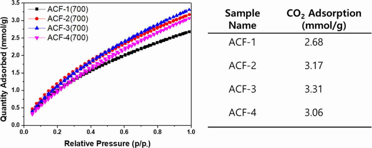 However, the CO₂ adsorption capacity did not align with the trend in surface area. ACF-4, which exhibited the largest surface area of 2095 m2/g, could only adsorb 3.06 mmol/g of CO₂, a value similar as ACF-2, whose surface area was only 1556 m2/g.